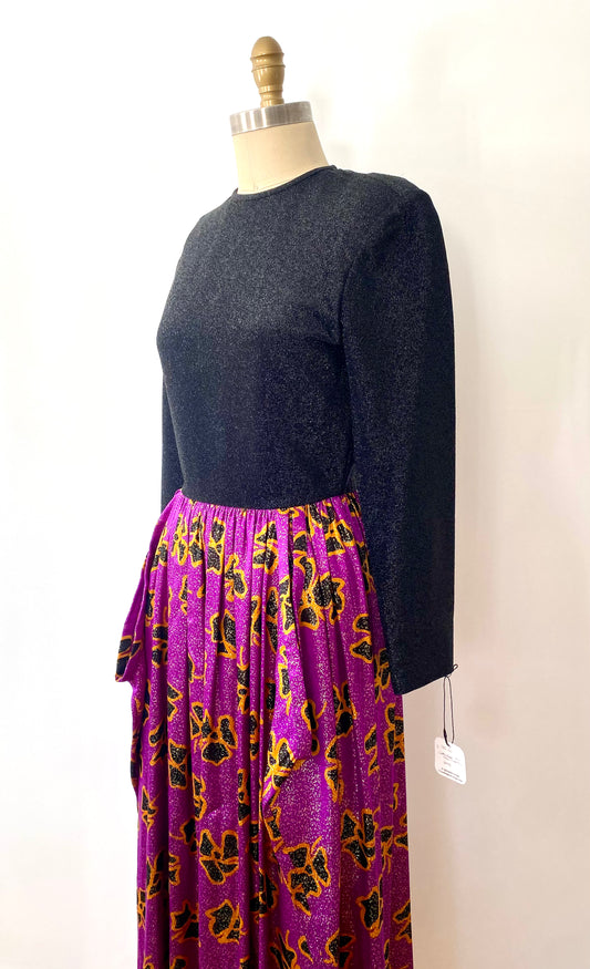 GEOFFREY BEENE, 1990s METALLIC PURPLE PRINTED LS DRESS