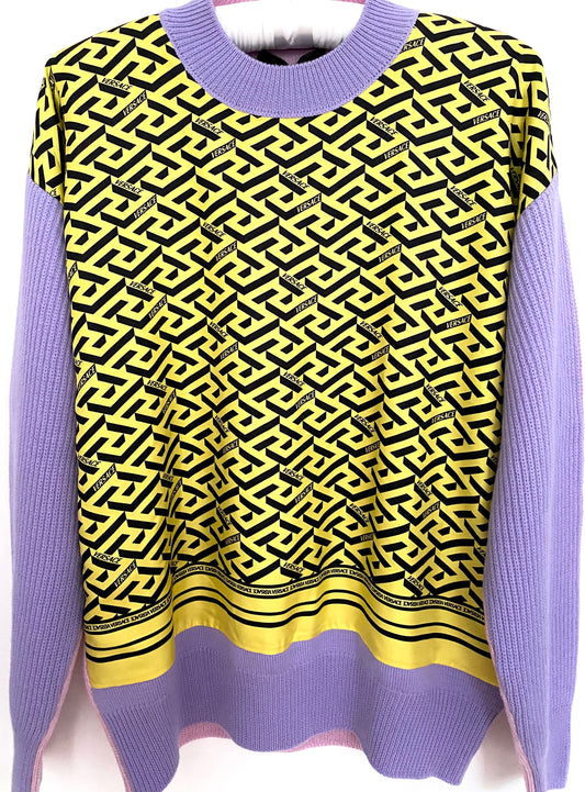 VERSACE, UNISEX PRINTED SILK/KNIT COLORBLOCK LS SWEATER (NEW W/ TAGS)