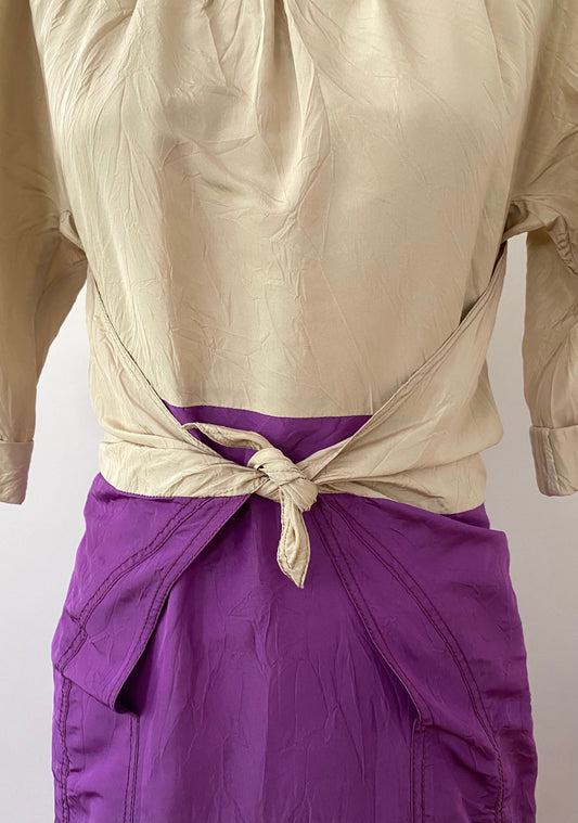 RICHARD CHAI, 1980s PURPLE AND NEUTRAL COLORED KNEE LENGTH DRESS